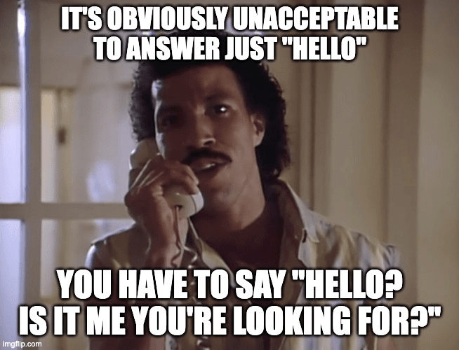 Something else I found on the interwebs: people crashing out on LinkedIn over how you greet someone on the phone. One recruiter from North Carolina posted (in all caps): “I returned the candidate’s call. His first words shocked me.” The candidate had left a very professional message, a high-level profile, but when the recruiter called back (from the same number), he answered, “Hello.” Apparently that mattered a lot. The recruiter couldn’t understand why professionals answer without saying who they are. As you can imagine, the post was met with ridicule. My favorite reply: “It’s obviously unacceptable to answer just ‘hello.’ You have to say, ‘Hello, is it me you’re looking for?’” (Yes, that’s Lionel Richie.)